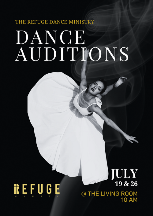 Auditions for the Refuge Dance Ministry are open to females, ages 13–30. No previous dance experience is required, but a willing heart and a desire to grow in worship are essential. The two-part audition will be held at The Living Room (15600 SW 288 St, Ste 304, Homestead, FL 33032) on Saturday, July 19th and 26th at 10 AM.